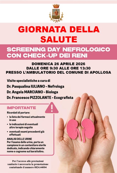 Si avvisa la cittadinanza che domenica 26 Aprile dalle ore 09:30 alle ore 13:30, presso l'Ambulatorio del Comune di Apollosa è previsto uno screening day nefrologico gratuito con medici specialisti, riservato ai residenti.
